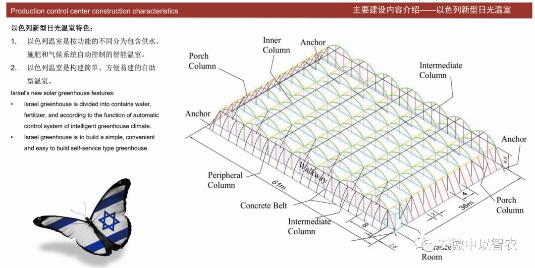 建成以色列高标准新型日光温室三栋9000平方米,每栋约3000平方米,一栋无土栽培技术实训基地;一栋有土栽培技术实训基地;一栋为工业化快速育苗棚。还建设10栋高标准越夏冷棚共7000平方米。