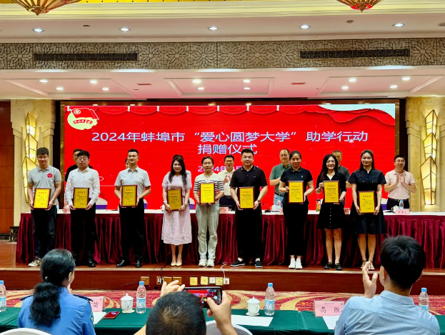 8月8日下午,2024年蚌埠市“爱心圆梦大学”助学行动捐赠仪式顺利举办,金业产业园作为爱心捐助单位受邀参加。副总经理张柳代表金业产业园在现场向受捐代表捐款,并接受青联主席团成员颁发的捐赠牌匾。