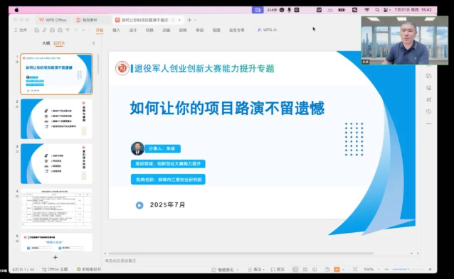 2025年7月31日下午,蚌埠市第五届退役军人创业创新大赛第一次线上能力提升培训正式举办。大赛组委会江淮创业研究院特邀宁波乾祥天检测技术有限公司董事长、创业大赛国赛评委忻志伟,中国创业培训讲师朱琰,分别从创业计划书与撰写要点,与项目路演PPT的制作与技巧,对所有报名参赛的项目进行专项能力提升。