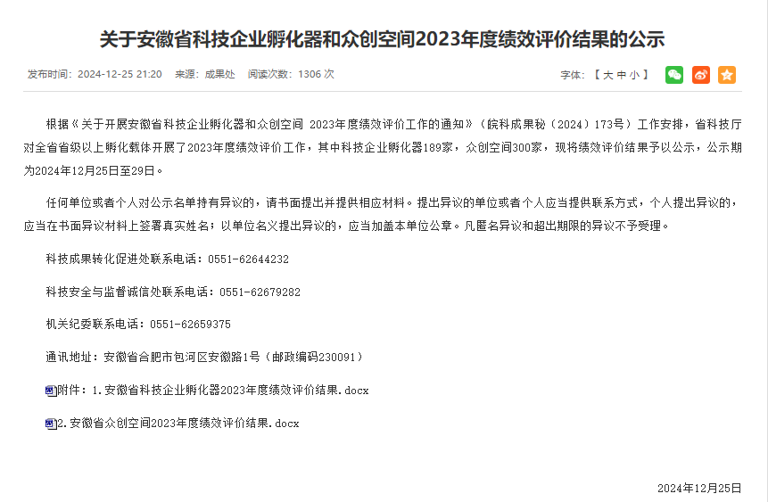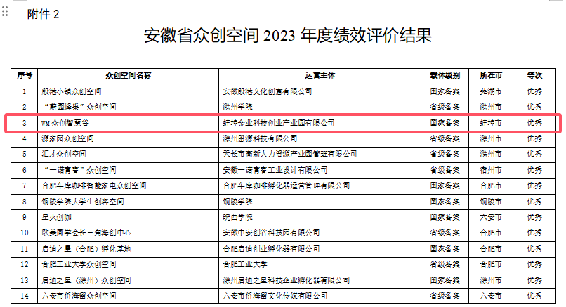 12月25日,安徽省科学技术厅发布《关于安徽省科技企业孵化器和众创空间2023年度绩效评价结果的公示》,蚌埠金业科技创业产业园及WM众创智慧谷分别获安徽省科技企业孵化器及众创空间2023年度绩效评价优秀,其中蚌埠金业科技创业产业园是蚌埠市唯一获得优秀绩效评价的孵化器。至此,金业产业园已连续三年获安徽省孵化器和众创空间绩效评价双优秀!