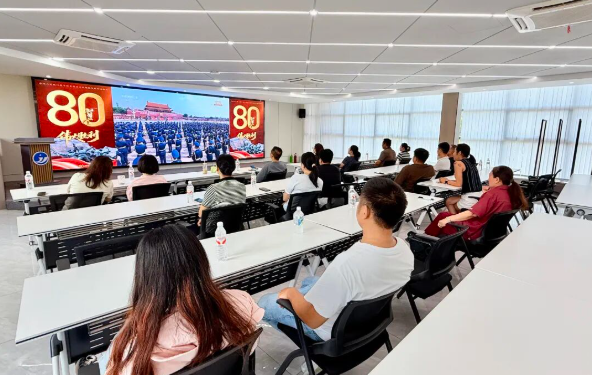 为纪念中国人民抗日战争暨世界反法西斯战争胜利80周年,弘扬伟大抗战精神,2025年9月3日上午,金业科技组织园区企业负责人,在多媒体会议厅集体观看了胜利80周年阅兵仪式。