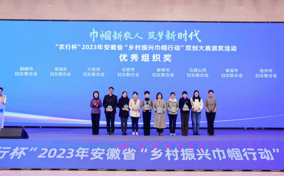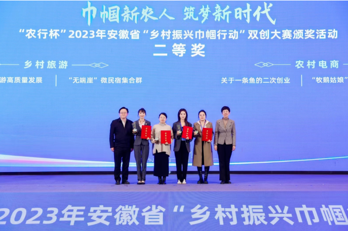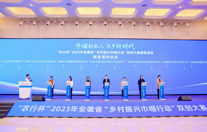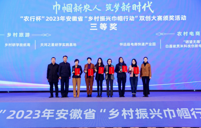由安徽省妇联联合省农业农村厅、省商务厅、省文化和旅游厅、省乡村振兴局举办的“农行杯”2023年安徽省“乡村振兴巾帼行动”双创大赛决赛于2023年11月13日在合肥圆满落下帷幕,代表蚌埠市参赛的安徽禾泉农庄生态农业有限公司的“禾泉娘子军助力乡村旅游高质量发展”项目荣获乡村旅游组二等奖,安徽天河之星现代农业科技发展有限公司的“天河之星研学实践基地”(乡村旅游组)、安徽恩远冷链物流管理有限公司的“怀远县电商快递产业园”(农村电商组)、安徽省准丰农业科技有限公司的“硒望无限白莲坡贡米科技创新电商助农”项目(农村电商组)荣获三等奖。蚌埠市妇联荣获优秀组织奖。在颁奖典礼现场,安徽恩远冷链物流管理有限公司和安徽省准丰农业科技有限公司分别与中国农业银行安徽省分行签订授信协议。