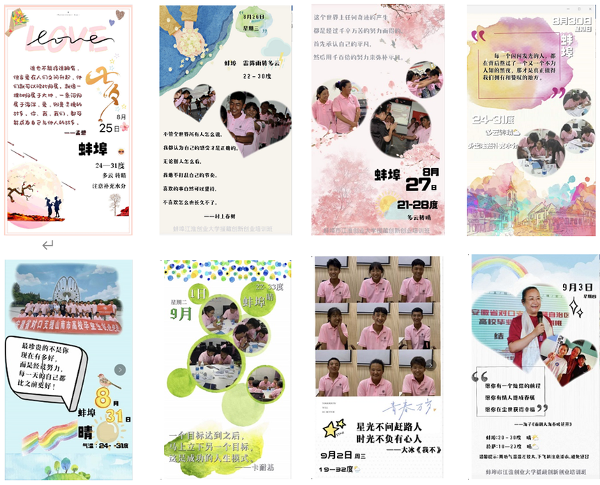 因为此次培训班是安徽省首期援藏创业培训班,蚌埠江淮创大以爱为主线,为了化解西藏学员交流沟通障碍,要求所有为本次培训服务的服务人员把微笑传递给每一位学员,每天发出励志、温馨的早安天气提示,用当下最流行、最受年轻人喜欢的VLOG记录学员每天的生活学习,用心拉近彼此的距离,用爱激发学员的奇思妙想和创意灵感!